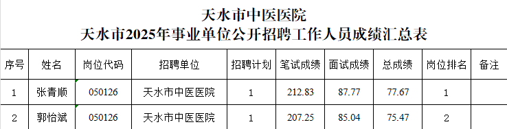 根據(jù)天水市人力資源和社會保障局《天水市2025年事業(yè)單位公開招聘工作人員公告》、《關(guān)于公布天水市2025年事業(yè)單位公開招聘工作人員資格復(fù)審?fù)ㄟ^人員名單和面試有關(guān)事項的通知》要求,經(jīng)筆試、面試環(huán)節(jié),現(xiàn)將我院2025年度事業(yè)單位公開招聘工作人員成績予以公告。